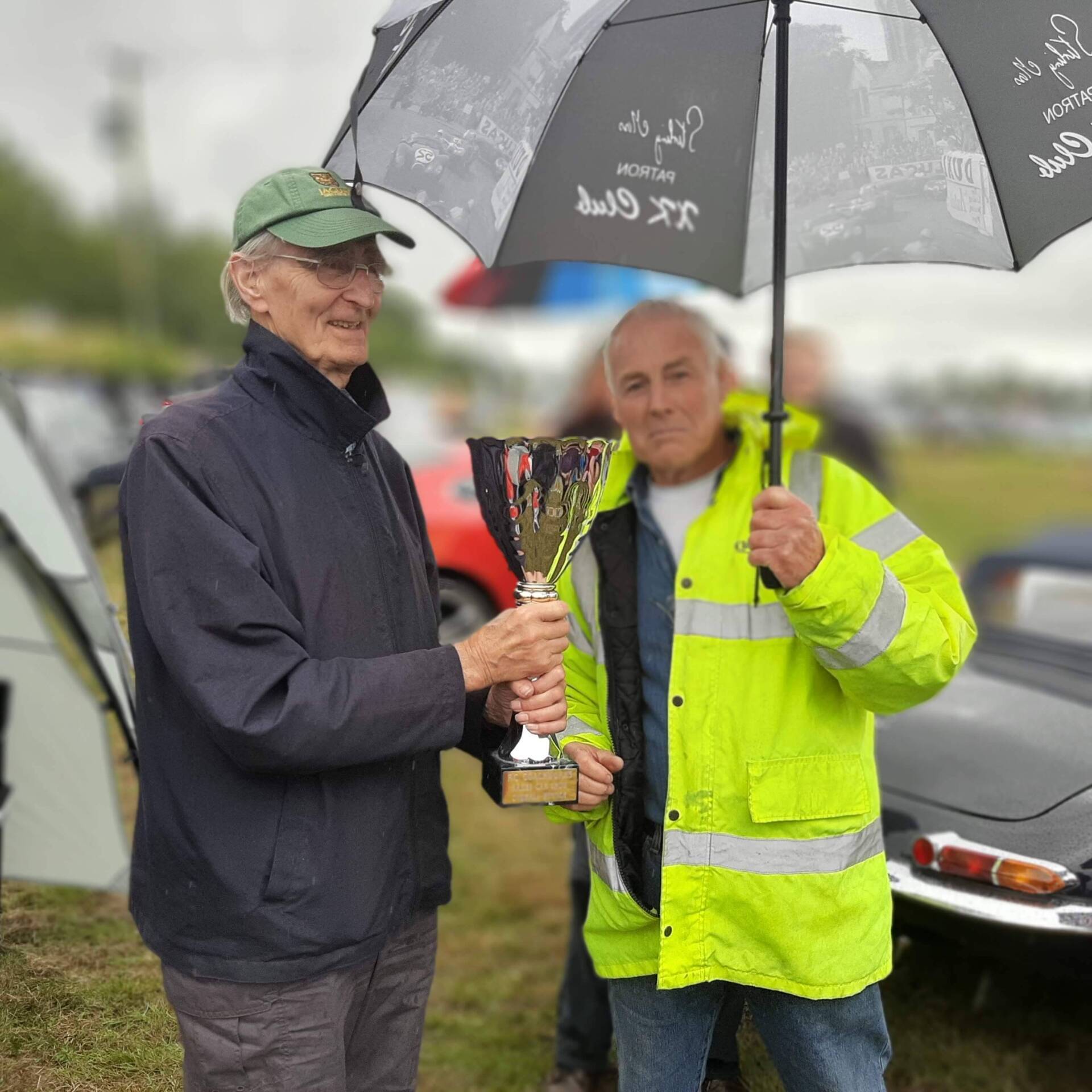 Here we have long term JDC member John Brockie presenting the Trophy donated by RC Coachworks for the Overall Winner on the Jaguar Drivers Club Scotland Stand at Kames car Show 2021 to Bob Caldow who brought the Ex John Lyons Jaguar works lemans xk Jaguar
